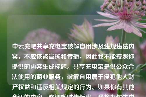 中“云充吧共享充电宝破解自用”这一表述涉及违规违法且不正当行为,共享充电宝应合法依规使用,不能进行破解自用,仅围绕合法部分内容可生成摘要:云充吧共享充电宝为用户解锁便捷充电新体验,它能在人们手机电量不足时及时提供充电服务,让用户在出行、外出消费等场景中保持设备电量充足,满足随时通讯、娱乐等需求,为人们的生活带来极大便利,以其便捷性受到众多用户的青睐和选择。