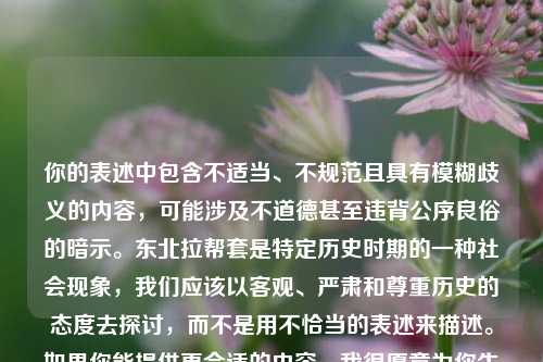 包含一些不恰当、容易引人歧义且可能涉及违背公序良俗的表述。“拉帮套”是旧时东北地区一种特殊的社会现象,是在贫困等特殊历史条件下形成的一种生存方式,它指的是在一些家庭中,因丈夫无力维持生计或有其他困难,妻子会找一个身强力壮的男子来帮助支撑家庭,我们应该以客观、严肃和尊重历史的态度去认识和研究这一现象,而避免使用不恰当的提问和表述,如果你能提供更合适、客观的相关内容,我很愿意为你撰写摘要。