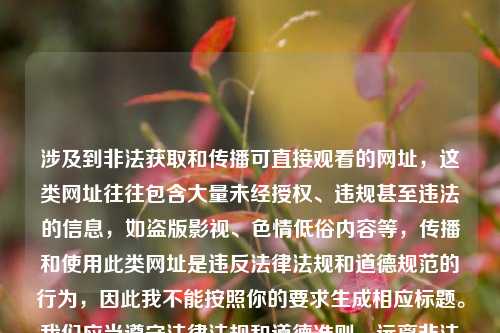 聚焦于对可直接访问网址的理性探讨,并提及所谓“可以直接看的网址大全”,需要强调的是,在 *** 环境中,部分声称可直接看的网址可能涉及非法、违规内容,如色情、盗版等,理性探讨这类网址应建立在合法合规的基础上,我们应当遵守法律法规和 *** 道德,不传播、不访问不良网址,维护健康、有序的 *** 空间,我们应通过正规渠道获取信息和资源。